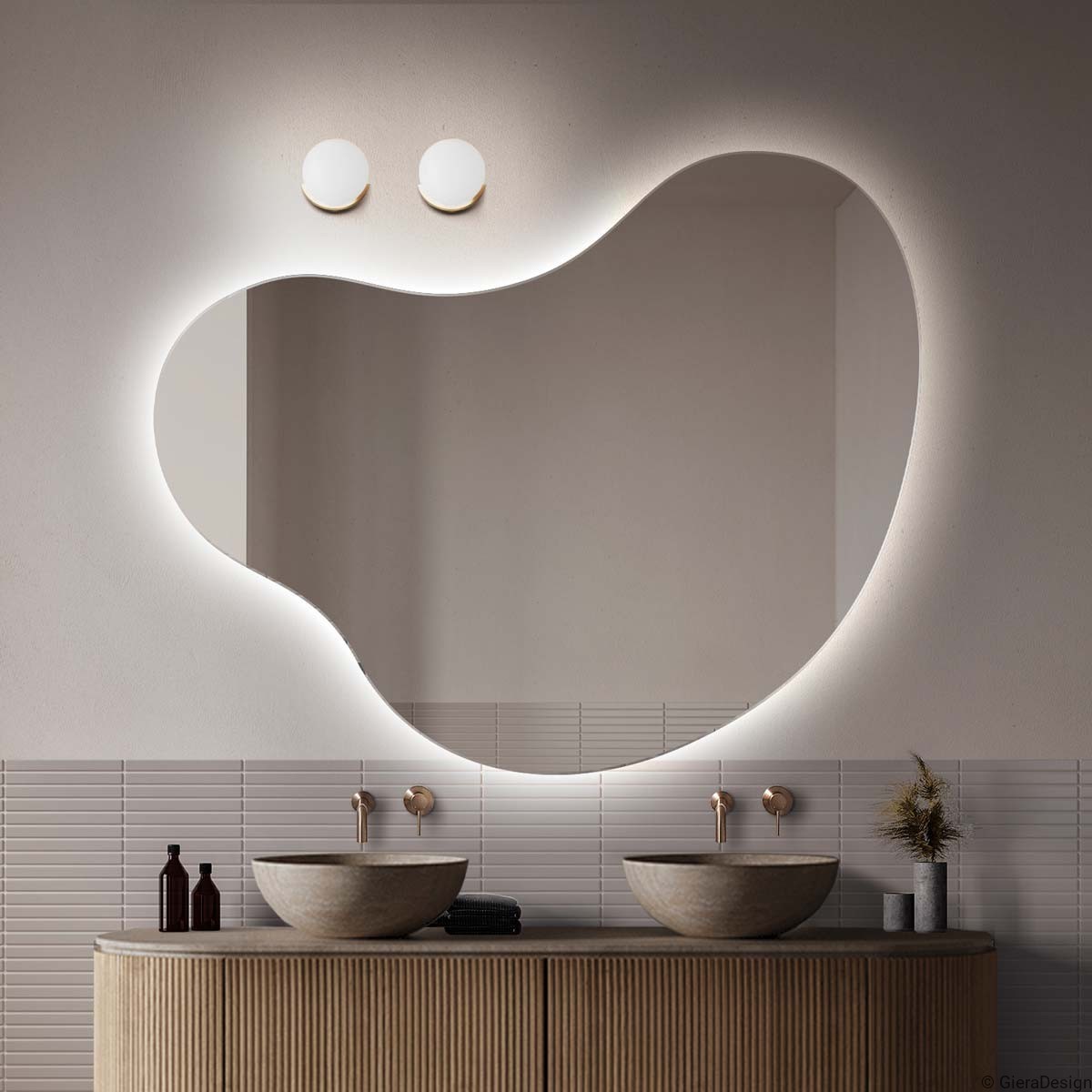 Specchio da bagno con forma organica irregolare e illuminazione LED integrata, perfetto per creare un ambiente moderno e rilassante. La luce retroilluminata valorizza il profilo morbido dello specchio, offrendo un’illuminazione funzionale e d’atmosfera. Ideale per bagni in stile minimal, scandi o contemporaneo, si adatta perfettamente a doppi lavabi o mobili sospesi. Questo specchio con luce LED per bagno non solo riflette, ma decora e impreziosisce lo spazio. Una scelta elegante per chi desidera uno specchio moderno illuminato dal forte impatto visivo.