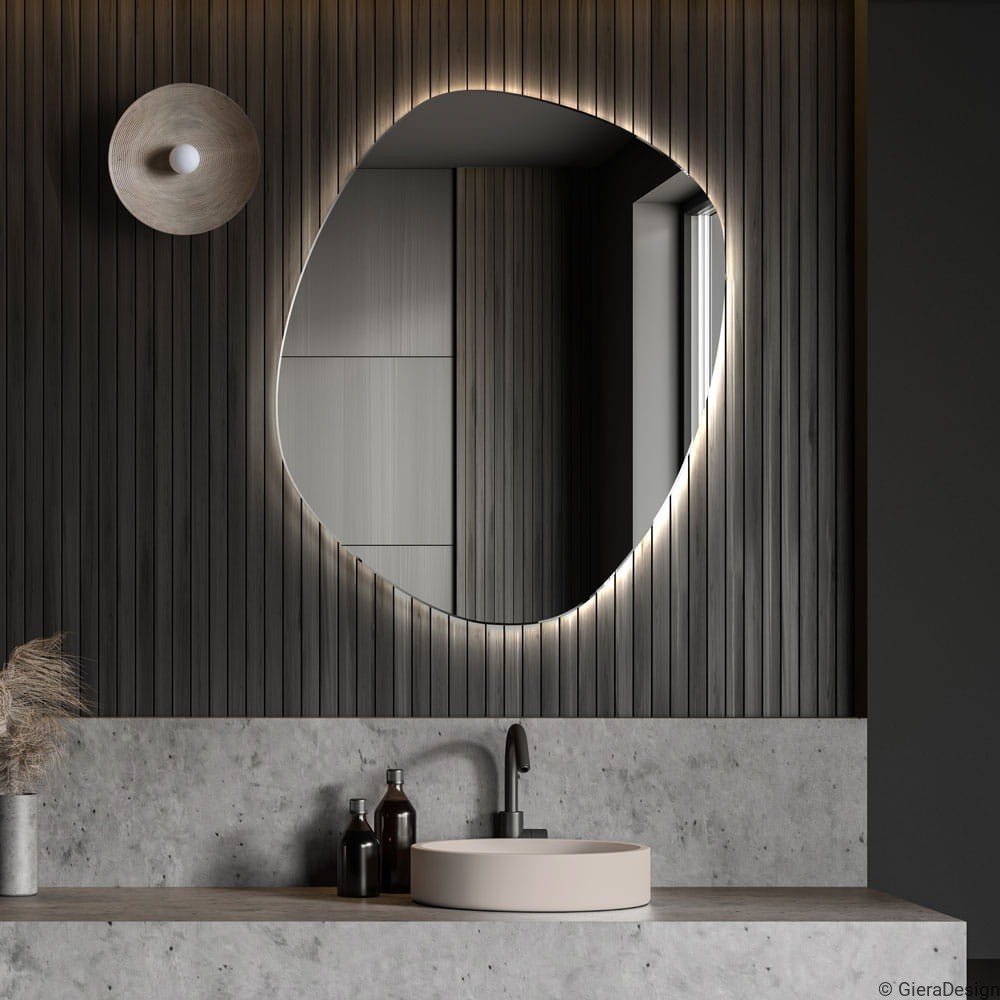 Questo specchio da bagno asimmetrico con retroilluminazione LED è il complemento perfetto per un ambiente moderno e ricercato. La sua forma organica si integra con pareti in legno scuro e superfici in cemento, creando un contrasto elegante e sofisticato. L’illuminazione soffusa valorizza le venature verticali e conferisce un’atmosfera intima, ideale per momenti di relax e cura personale. Realizzato con materiali di alta qualità, questo specchio di design dona un tocco contemporaneo all’arredo bagno, unendo funzionalità, stile e armonia visiva.