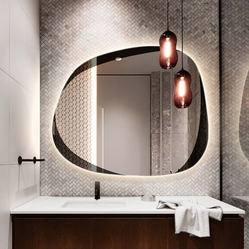 Rinnova il tuo bagno con questo esclusivo specchio bagno moderno con luce LED. Il suo design organico e irregolare cattura lo sguardo, mentre il vetro grafite dona profondità e raffinatezza. Perfetto per ambienti contemporanei, questo specchio decorativo retroilluminato unisce stile e funzionalità. L’illuminazione a LED integrata crea un’atmosfera rilassante e garantisce una visibilità ottimale. Ideale come specchio bagno di design, è facile da installare e si abbina a materiali moderni come marmo, legno scuro e metallo nero. Una scelta elegante per chi ama il design d’interni d’avanguardia.