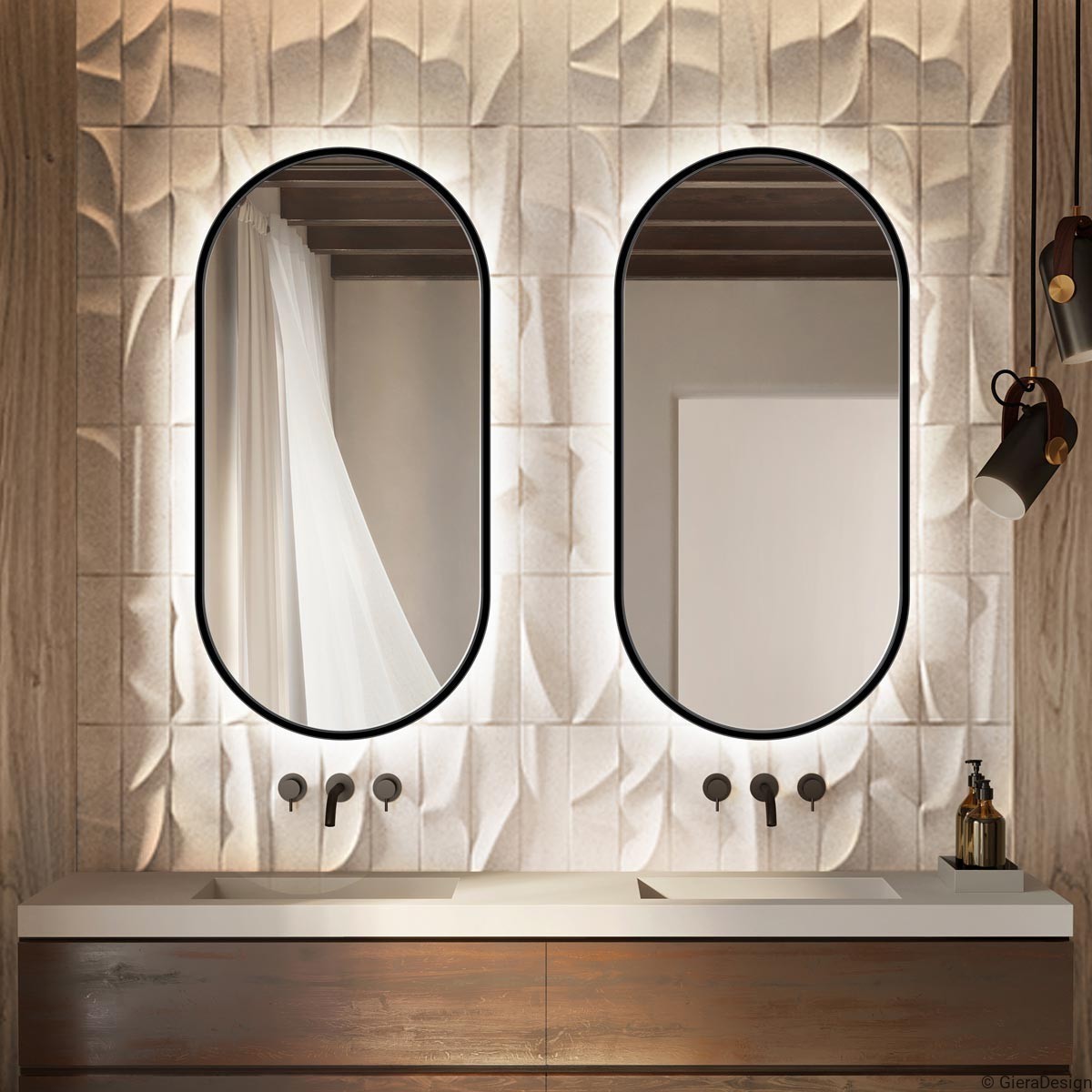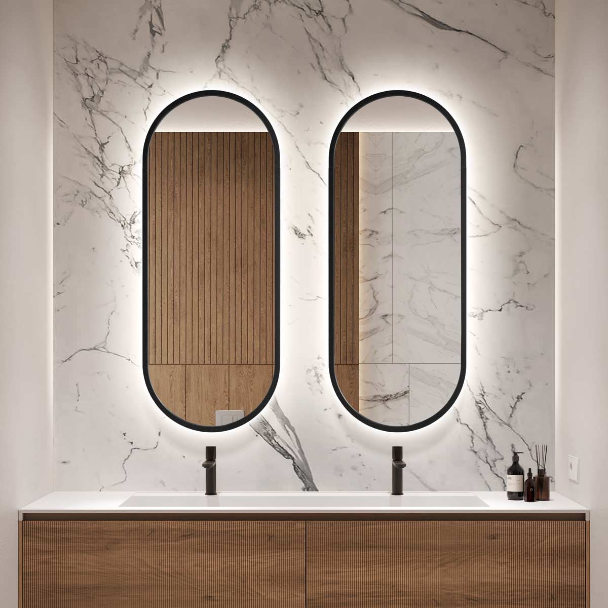 Questo specchio da bagno con illuminazione LED integrata unisce estetica e funzionalità in un design moderno. La cornice nera sottile incornicia la forma ovale con angoli morbidi, perfetta per ambienti eleganti e contemporanei. L’effetto retroilluminato dona profondità e una luce soffusa ideale per la zona lavabo. Ideale come specchio moderno bagno, si adatta anche a spazi wellness o suite di hotel. La finitura minimale esalta materiali naturali e rivestimenti 3D. Un accessorio must-have per chi cerca uno specchio da parete con luce di alta qualità e dal forte impatto decorativo.