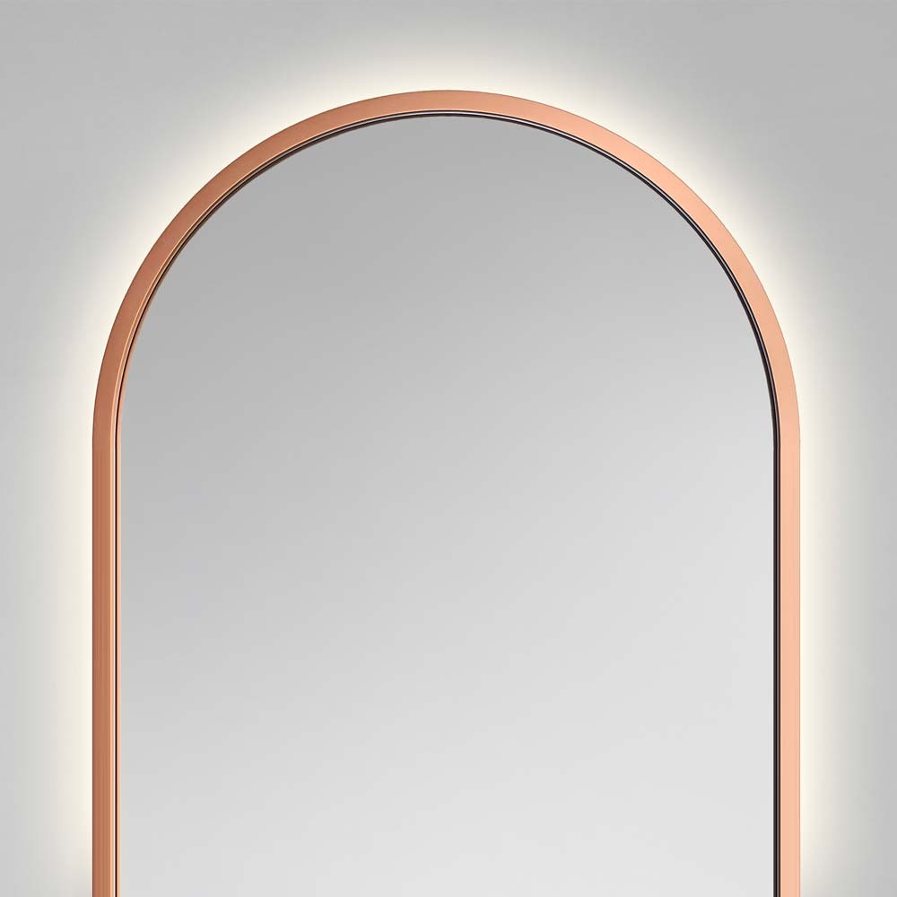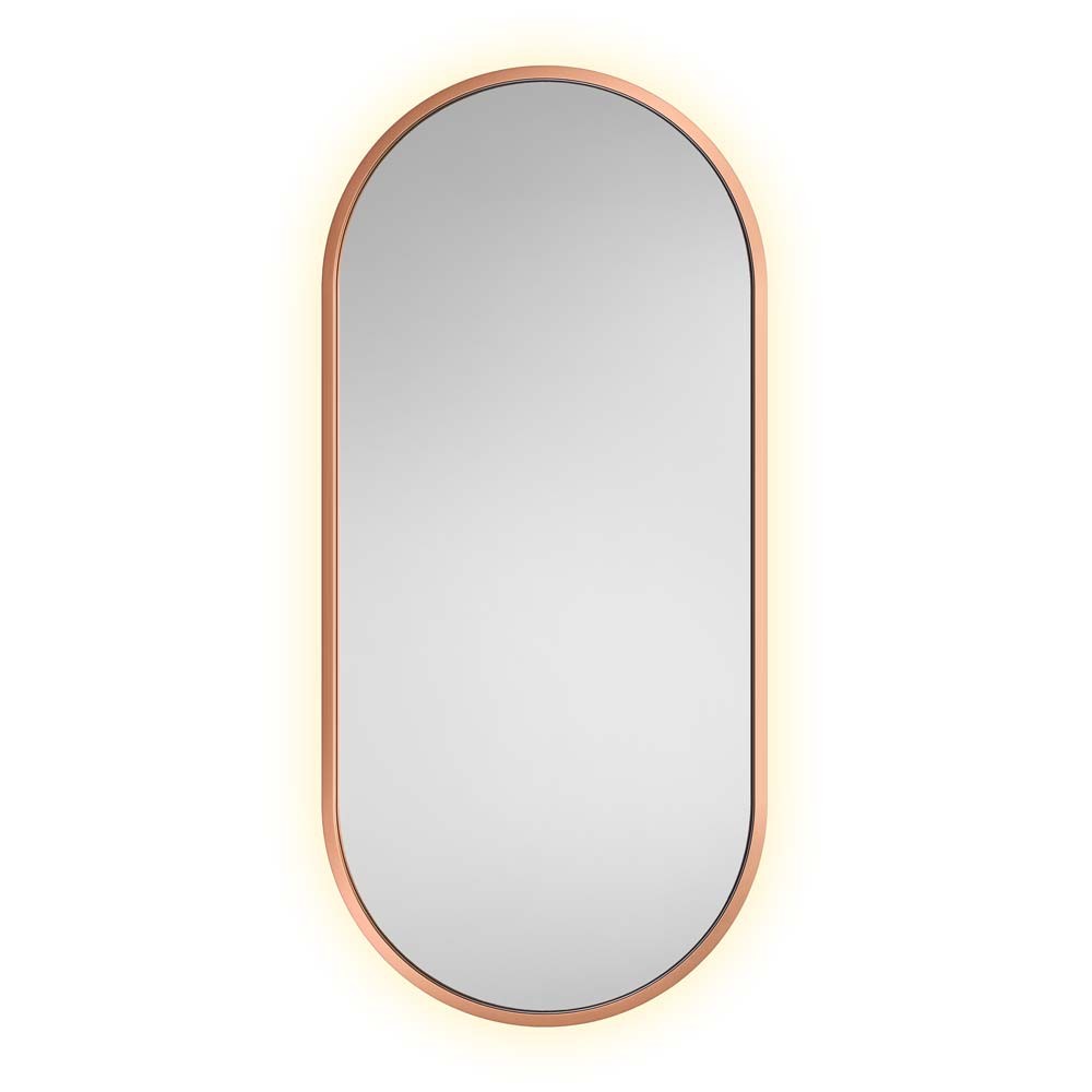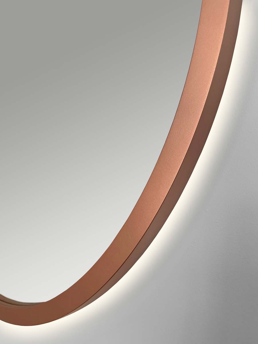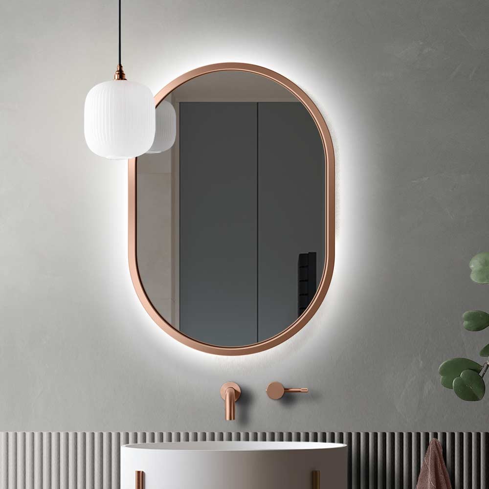 Questo specchio da bagno con cornice rame e luce LED integrata è la soluzione ideale per arredare ambienti moderni con un tocco caldo e sofisticato. La finitura rame satinato dona eleganza e si abbina perfettamente a materiali naturali come legno e pietra. La retroilluminazione LED garantisce una luce morbida ma funzionale, perfetta per le attività quotidiane. La forma ovale con angoli stondati crea un effetto visivo armonioso, adatto a bagni contemporanei, minimal o in stile Japandi. Realizzato con materiali di alta qualità, questo specchio illuminato da parete è un elemento di design che unisce stile e praticità.