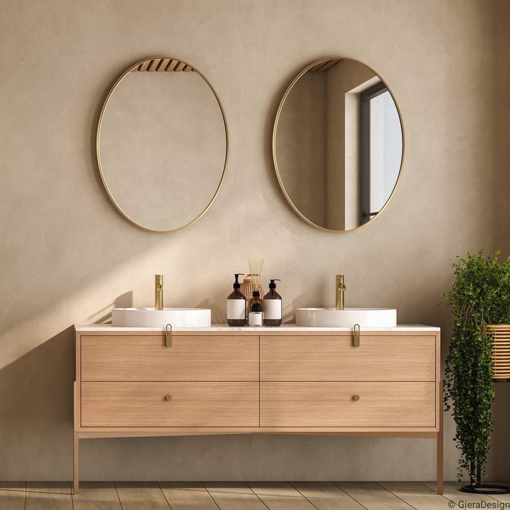Specchio ovale retroilluminato con cornice minimalista di colore oro. Grazie alla sua forma, si adatta perfettamente a qualsiasi ambiente, che sia di stile scandinavo, contemporaneo, moderno o classico. Questo bello specchio di tendenza aggiungerà stile ed eleganza al tuo bagno. Realizzato su ordinazione con vetri di eccellente qualità, di alta trasparenza e luminosità provenienti dal Belgio. Assemblato con cura per rinforzare la sua originalità e unicità.