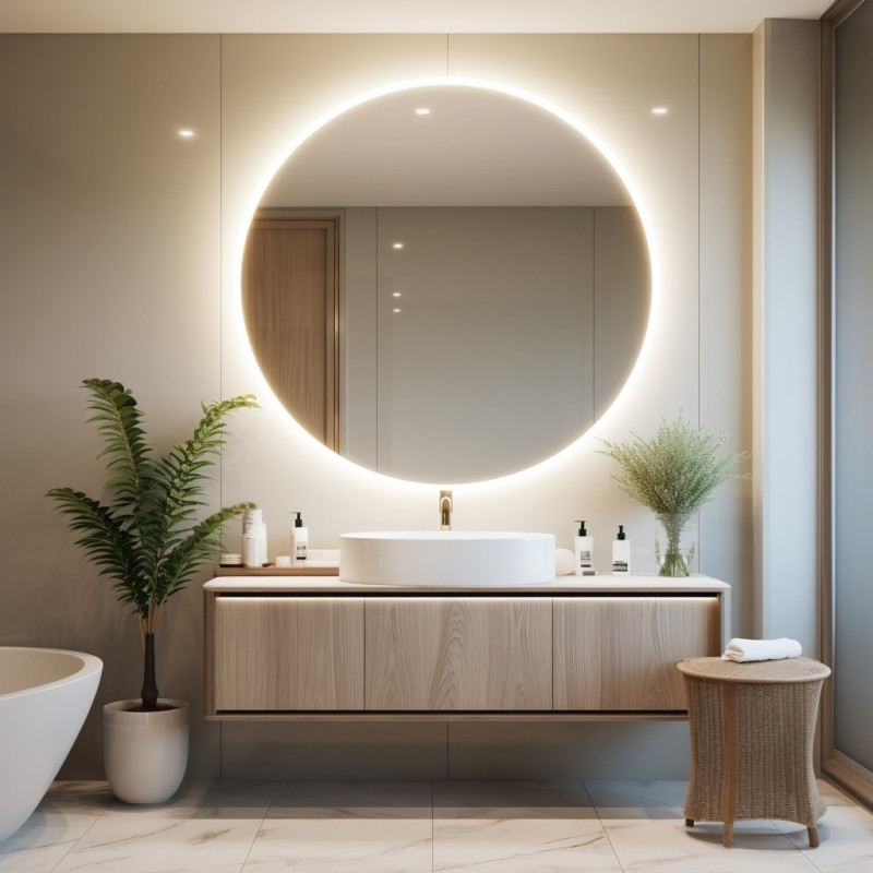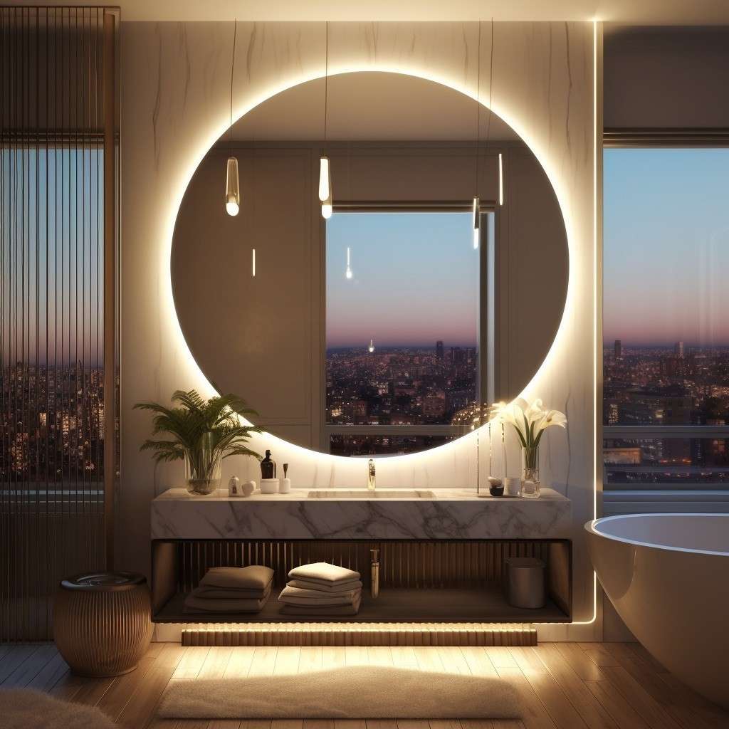Questo specchio rotondo retroilluminato LED è la scelta ideale per chi desidera un bagno elegante e di design. La retroilluminazione diffonde una luce uniforme e suggestiva, creando un’atmosfera calda e accogliente che valorizza l’ambiente. Realizzato in cristallo di alta qualità, garantisce nitidezza e resistenza, diventando non solo un complemento funzionale ma anche un vero elemento decorativo. Lo specchio bagno moderno con illuminazione integrata è perfetto per completare arredi minimal, contemporanei o luxury, trasformando lo spazio in un ambiente esclusivo e sofisticato.