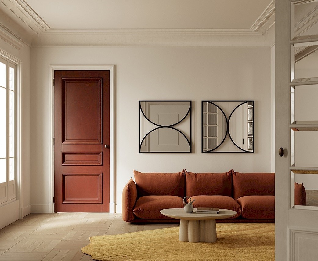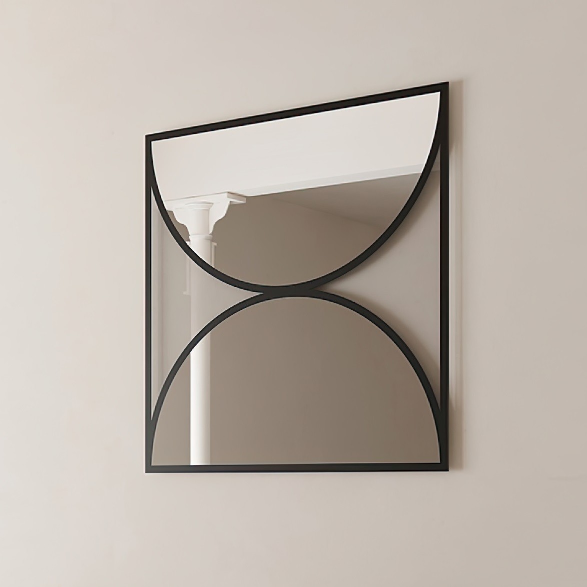 Questo specchio dal design senza tempo gioca abilmente con la trasparenza e la riflessione, unite in forme geometriche essenziali. A prima vista, il design sembra presentare un elegante bordo nero metallico che circonda le sezioni a specchio e i bordi esterni. Tuttavia, osservando più da vicino, il bordo nero si rivela essere una sottile stampa, mentre le parti trasparenti permettono al colore della parete di emergere, consentendo allo specchio di ridefinire qualsiasi spazio.