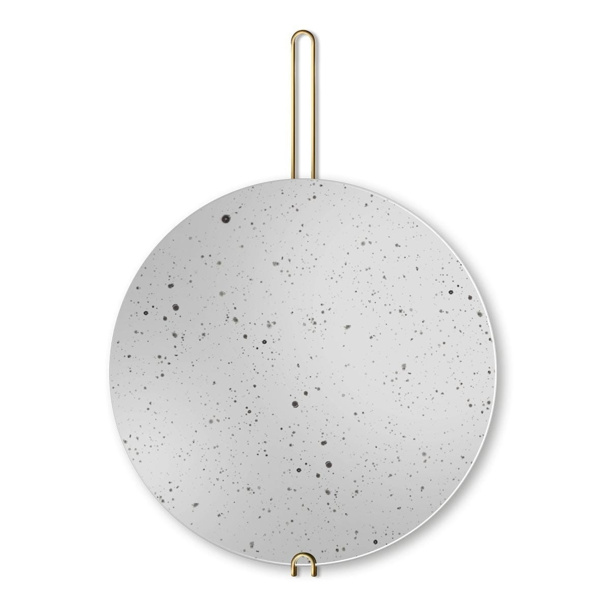 - Lastra di specchio rotonda sospesa su un supporto in ottone lucidato.
