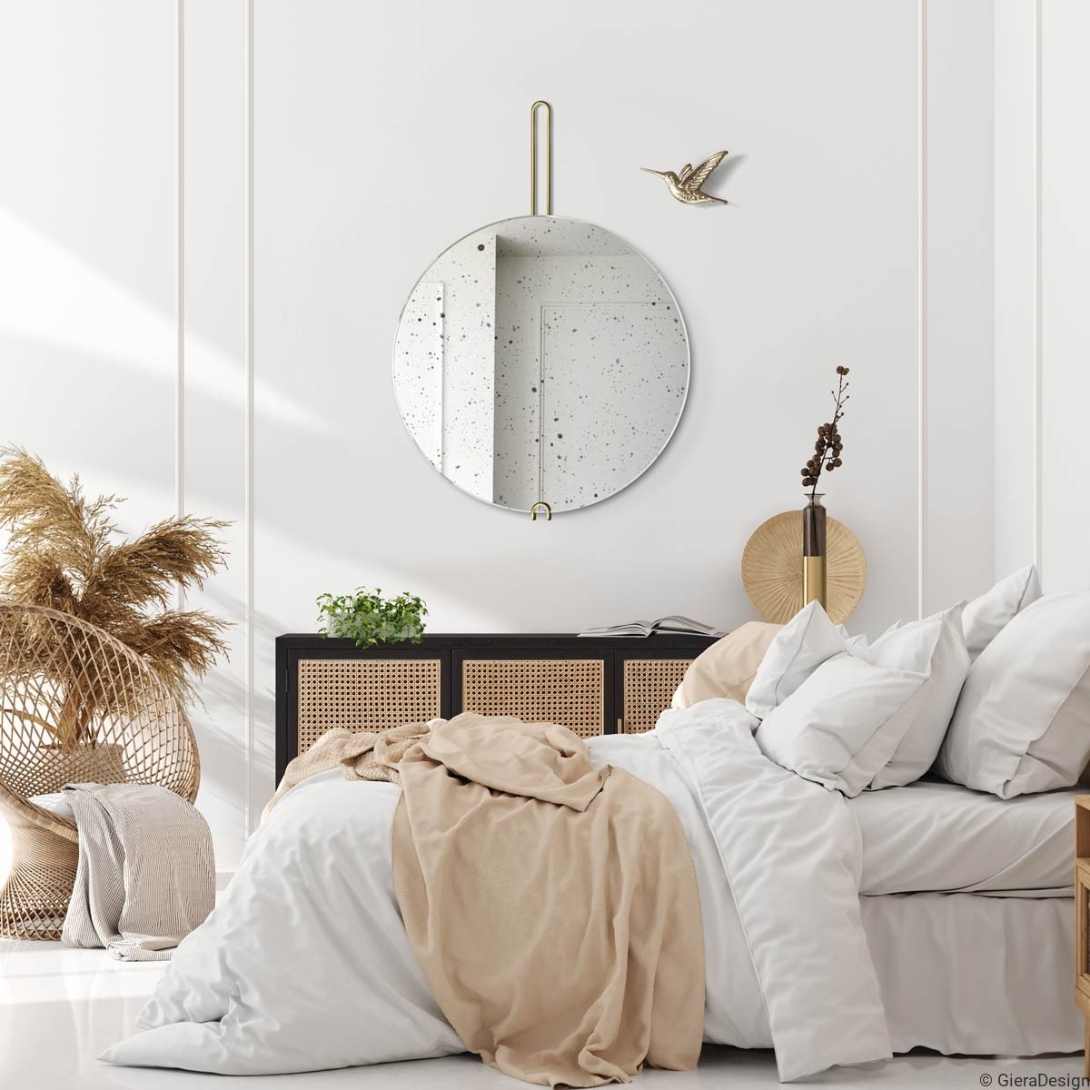 Questo specchio rotondo anticato con vetro maculato e gancio in ottone dorato dona un tocco vintage sofisticato a qualsiasi ambiente. Il design con finitura a effetto invecchiato aggiunge carattere e profondità, perfetto per interni boho, eclettici o classici rivisitati. Il sistema di sospensione a staffa lunga rende l'installazione elegante e decorativa. Un elemento di design che si distingue per stile e originalità, ideale in camera da letto, ingresso o soggiorno. Ogni specchio è unico grazie alla superficie irregolare che riflette la luce in modo suggestivo.