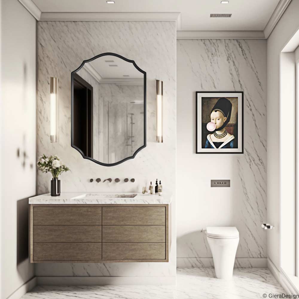 Raffinato e originale, questo specchio sagomato da bagno con cornice nera è il complemento perfetto per ambienti eleganti e moderni. Il profilo curvo e ornamentale dona un tocco artistico e rétro, mentre la finitura nera opaca della cornice aggiunge un contrasto deciso, ideale su rivestimenti chiari come marmo o pietra. Questo specchio decorativo unisce design classico e minimalismo contemporaneo, adattandosi perfettamente a interni di lusso, hotel boutique o abitazioni dallo stile distintivo. Realizzato con materiali resistenti all’umidità, è una scelta sicura e di grande impatto visivo per qualsiasi bagno di classe.