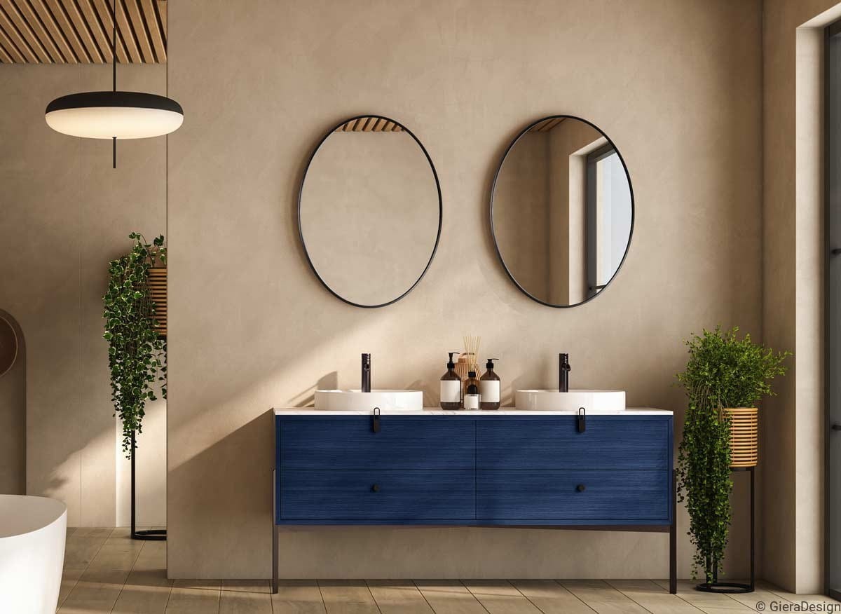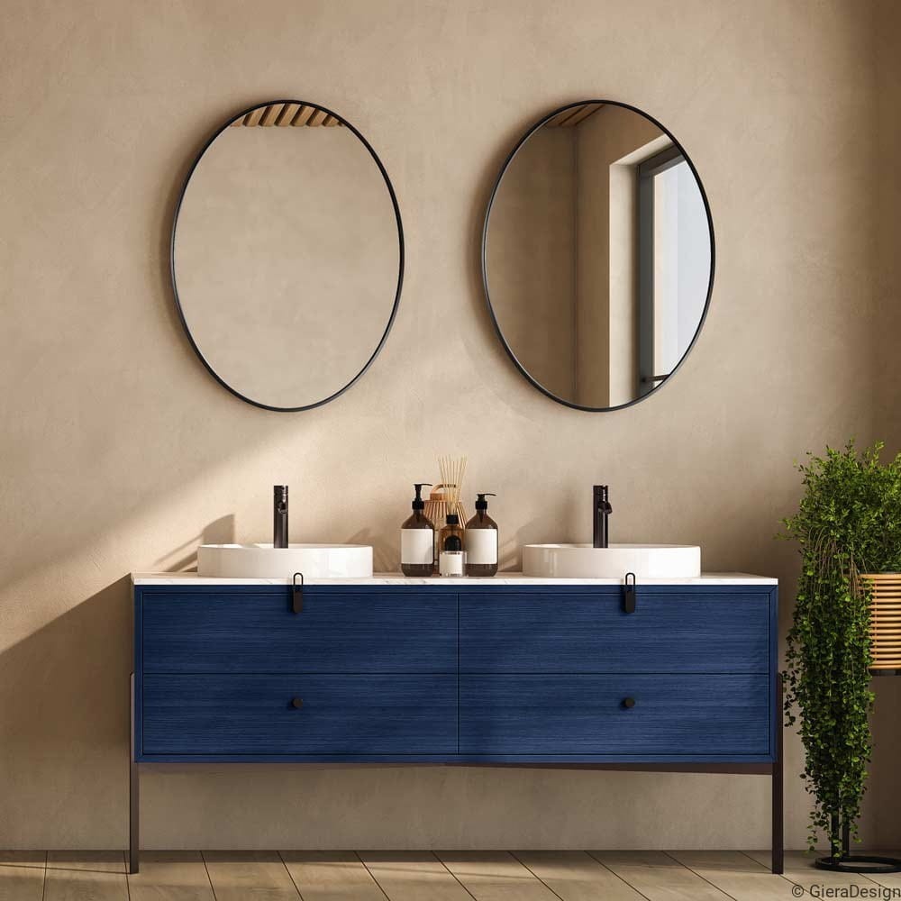 Lo specchio ovale con cornice nera è la scelta perfetta per un bagno moderno ed elegante. Il profilo sottile in metallo nero opaco crea un contrasto raffinato con pareti chiare e arredi colorati, come il mobile blu in questa composizione. Ideale come specchio da bagno contemporaneo, unisce funzionalità e stile grazie alla sua forma essenziale e al design pulito. Valorizza la luce naturale, amplia lo spazio visivo e si adatta anche a ingressi o camere da letto minimal. Scegli tra i migliori specchi ovali neri per dare carattere al tuo ambiente con un tocco di design moderno.