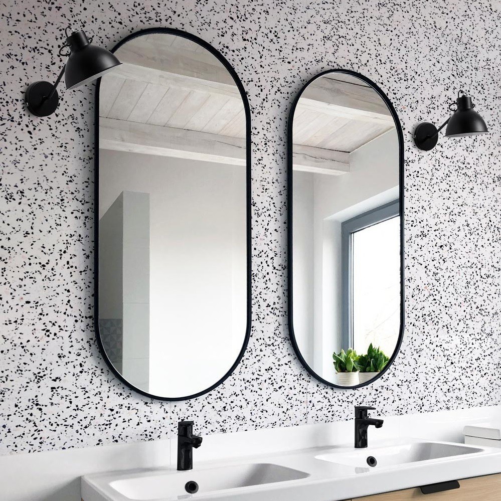 Questo moderno specchio per bagno con cornice nera è la soluzione ideale per arredare con stile ambienti funzionali e contemporanei. La forma ovale allungata con angoli morbidi dona eleganza e verticalità, perfetta per bagni piccoli o stretti. Il bordo nero minimalista crea un contrasto raffinato con piastrelle chiare o superfici terrazzo, adattandosi a stili industrial, minimal o scandinavi. Realizzato con materiali resistenti all’umidità, questo specchio decorativo da parete è pratico, elegante e durevole. Un vero tocco di design per chi desidera un bagno essenziale ma di forte impatto visivo.