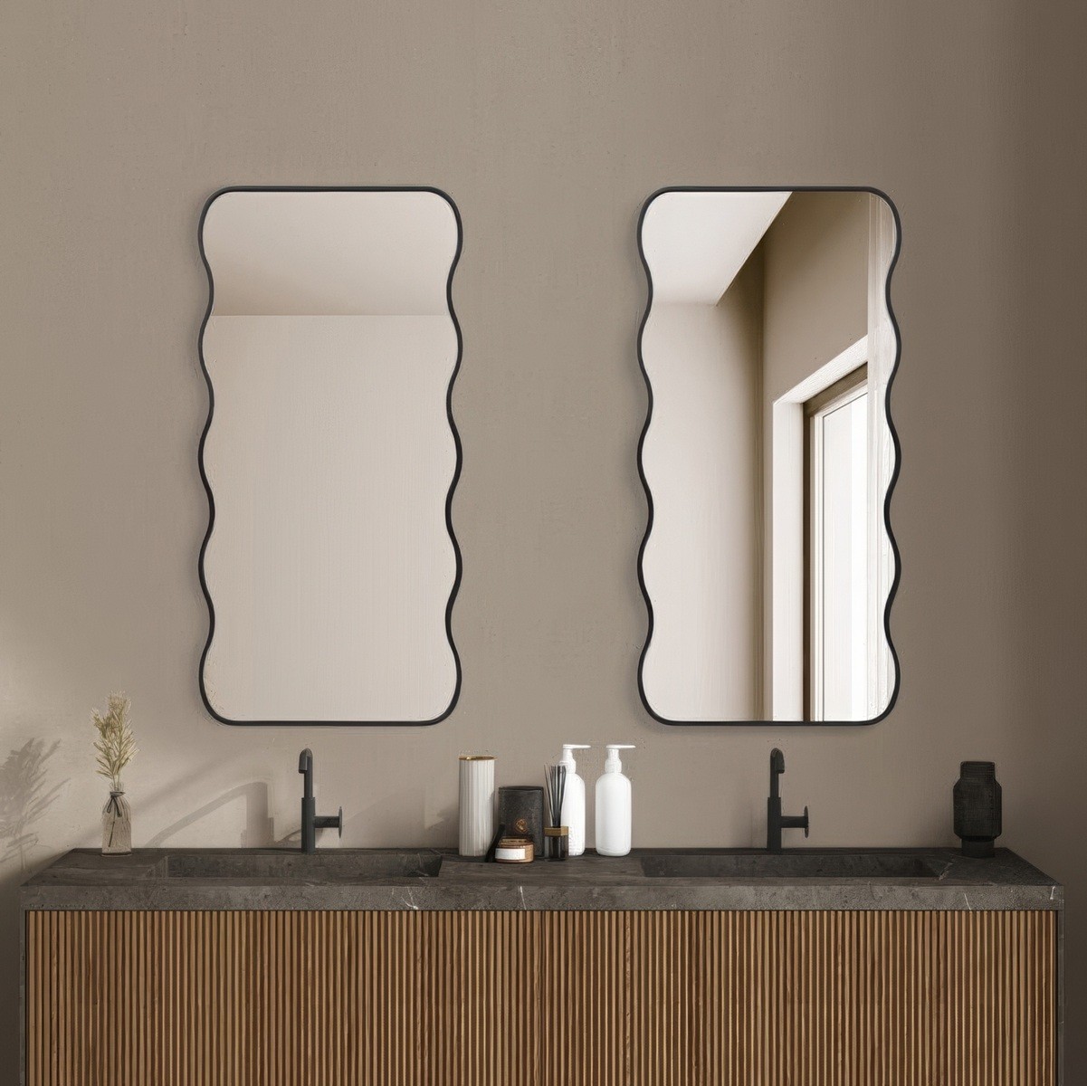 Questi specchi rettangolari Wavy con bordo ondulato sono perfetti per aggiungere un tocco di modernità e movimento al tuo bagno. Il loro profilo sinuoso crea un effetto visivo accattivante, ideale per ambienti minimalisti e contemporanei. La loro superficie ampia riflette la luce naturale, amplificando la luminosità e la profondità dello spazio. Perfetti sopra un doppio lavabo, offrono praticità ed eleganza in un’unica soluzione.