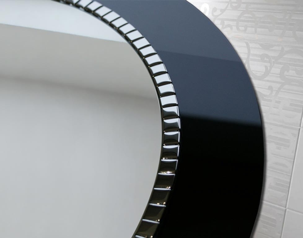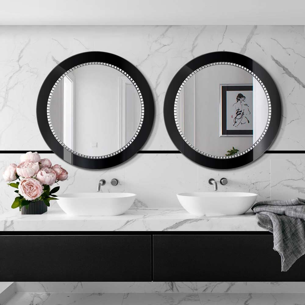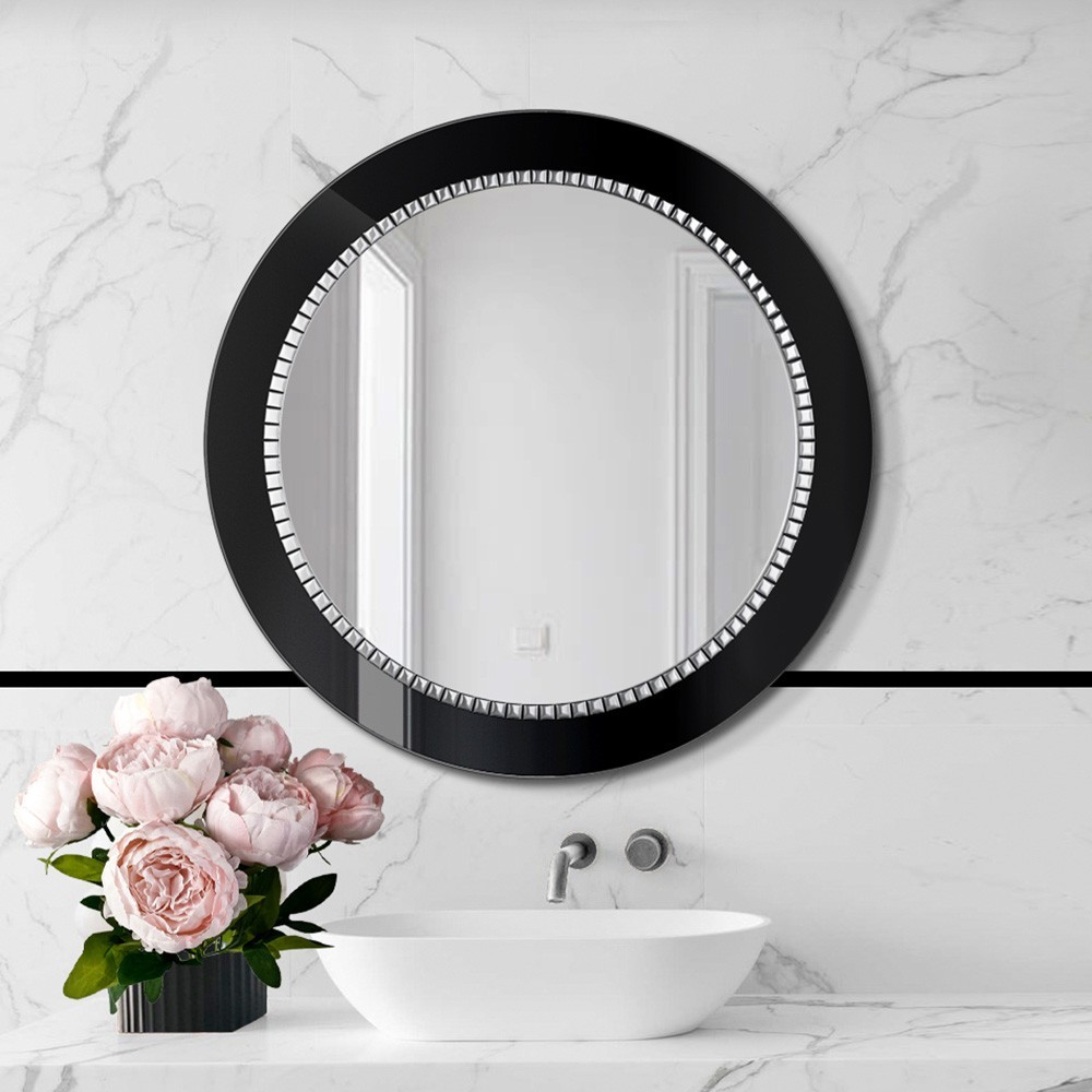 Lo specchio rotondo con cornice nera lucida e bordo interno decorativo a rilievo è una scelta raffinata per chi desidera aggiungere un tocco di eleganza moderna al bagno. La cornice nera dona profondità visiva, mentre il mosaico argentato interno cattura la luce creando un effetto gioiello che impreziosisce la parete. Ideale sopra lavabi sospesi o mobili minimalisti, si integra perfettamente in ambienti contemporanei, monocromatici o in contrasto con marmi chiari. Oltre a essere funzionale, questo specchio è anche un elemento decorativo che valorizza l'interior design con un'estetica sobria ma di carattere.