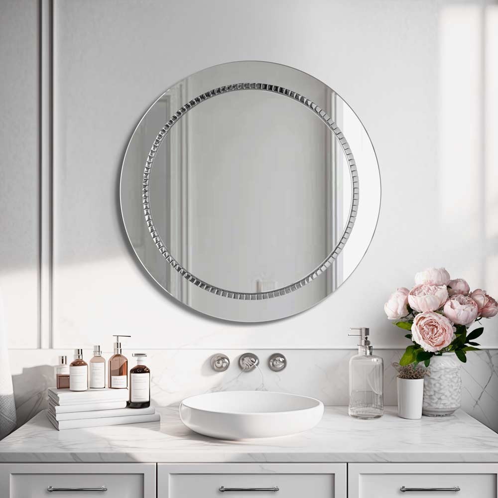 Lo specchio rotondo con cornice a specchio e decorazione interna in mosaico argentato dona un tocco di lusso e raffinatezza a qualsiasi bagno. Il bordo riflettente si fonde armoniosamente con la parete, mentre il mosaico brillante cattura la luce, creando giochi visivi eleganti e delicati. Ideale in ambienti in stile contemporaneo, neoclassico o glamour, questo specchio decorativo valorizza lavabi sospesi, consolle o mobili bagno in marmo. Oltre alla funzionalità, offre un impatto estetico importante, rendendolo un protagonista dell’arredo. Una scelta perfetta per chi cerca specchi bagno eleganti, design sofisticato e materiali di alta qualità.