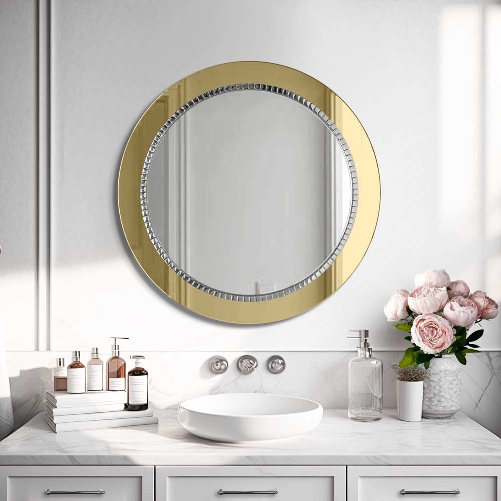 Specchio rotondo da bagno con cornice dorata lucida e dettagli interni effetto cristallo. Ideale per ambienti eleganti, glamour o in stile classico-moderno, questo specchio valorizza il lavabo con raffinatezza. La finitura dorata riflette la luce naturale e artificiale, creando un’atmosfera luminosa e sofisticata. Perfetto per chi desidera arredare il bagno con uno specchio decorativo e funzionale, capace di donare profondità e carattere. Un complemento ideale per bagni chic e raffinati.