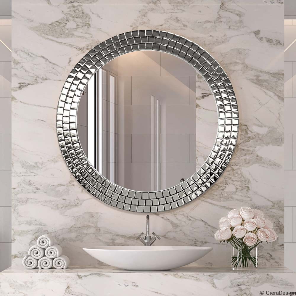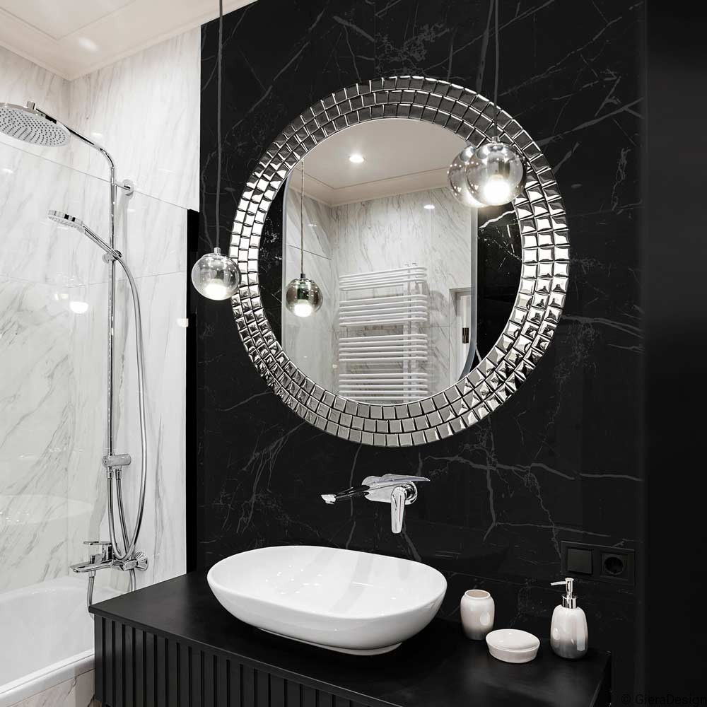 Specchio rotondo da bagno con cornice a mosaico colore argento. Elegante e di grande impatto visivo, riflette la luce naturale e artificiale, ampliando e illuminando l’ambiente. Ideale sopra il lavabo, dona un tocco di raffinatezza e lusso al bagno moderno. Il bordo a tessere riflettenti crea giochi di luce dinamici e decorativi, perfetti per ambienti sofisticati o glamour. Uno specchio funzionale e scenografico, pensato per trasformare la zona lavabo in un angolo di design.