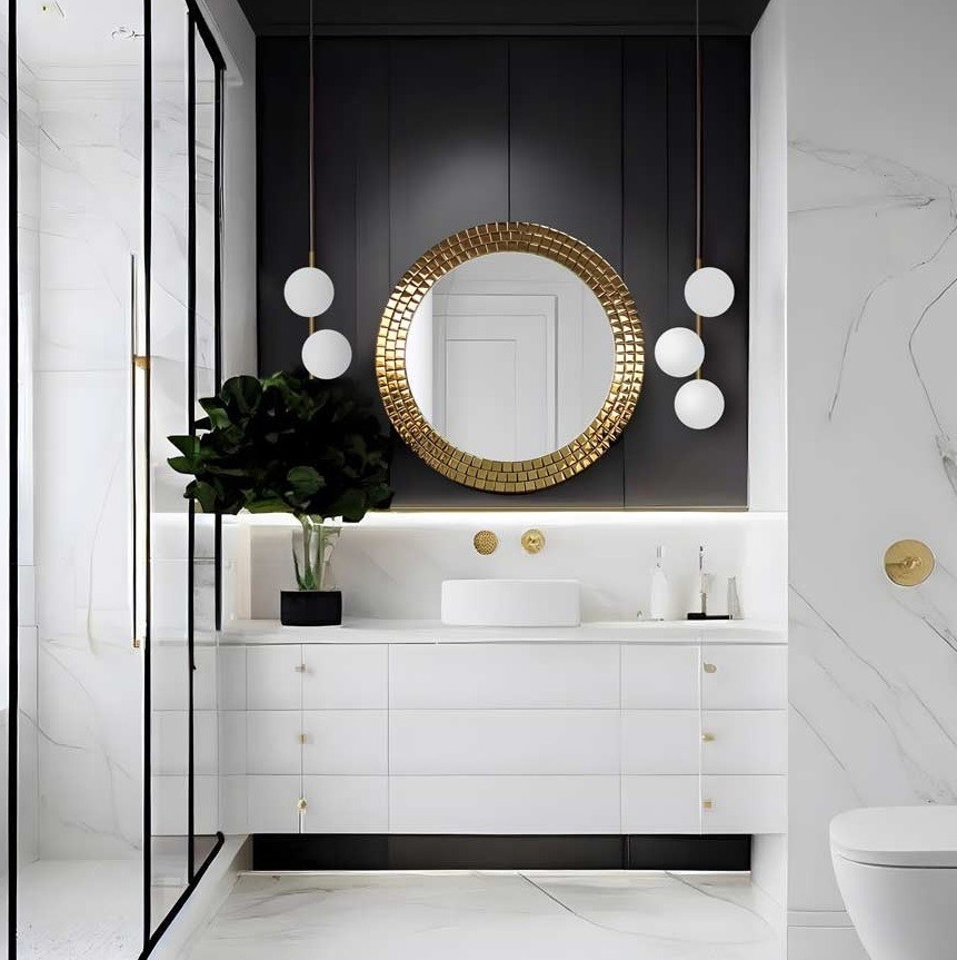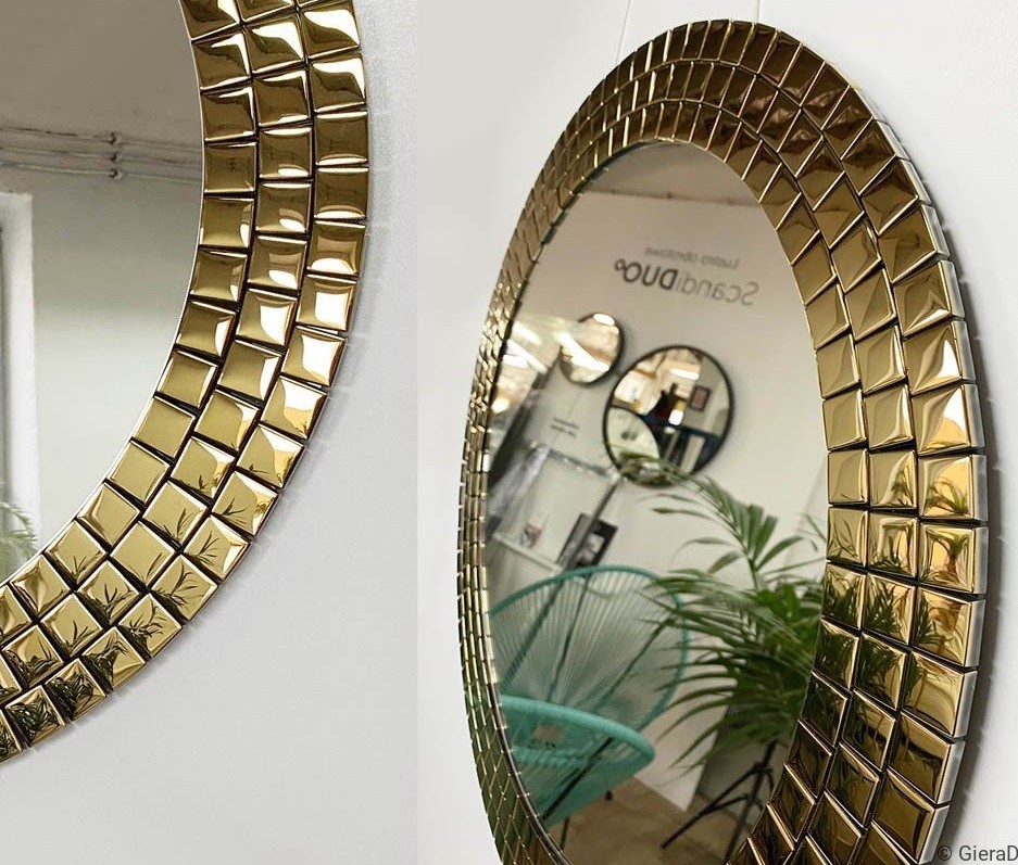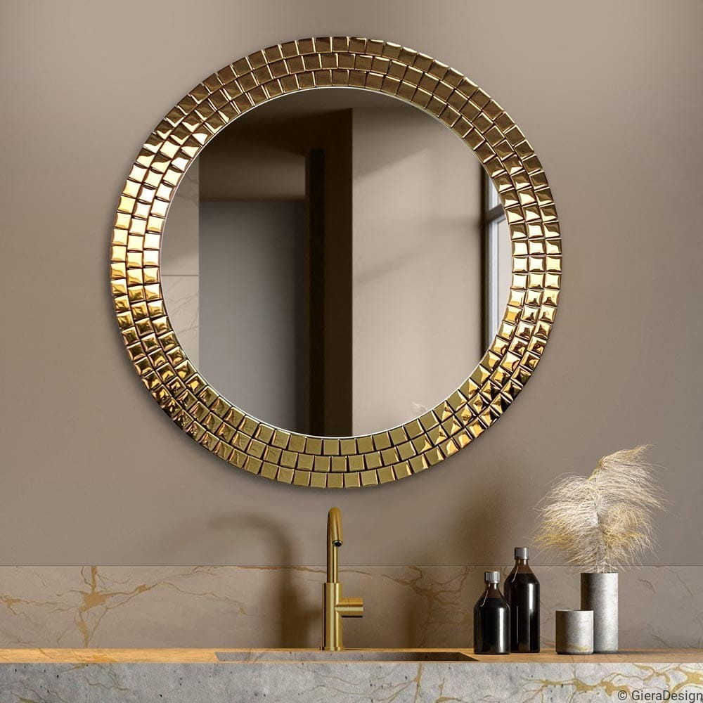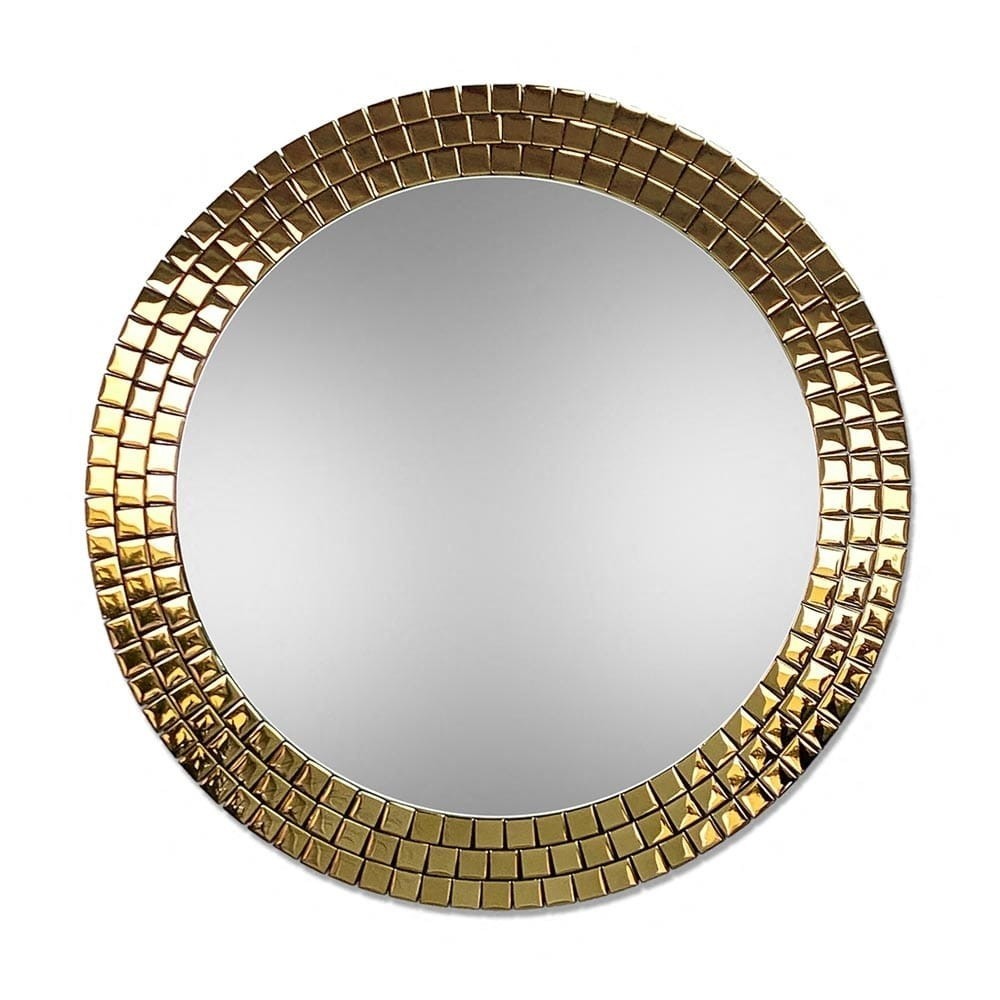 Specchio rotondo da bagno con cornice dorata a mosaico. Un complemento d’arredo raffinato che unisce estetica e funzionalità, ideale per bagni eleganti e contemporanei. Il bordo dorato riflette la luce e dona luminosità all’ambiente, creando un effetto visivo di grande impatto. Perfetto sopra un lavabo con rubinetteria in ottone o finiture oro, questo specchio decorativo esalta lo stile glamour o moderno. Una scelta di design per chi desidera un bagno esclusivo e sofisticato.